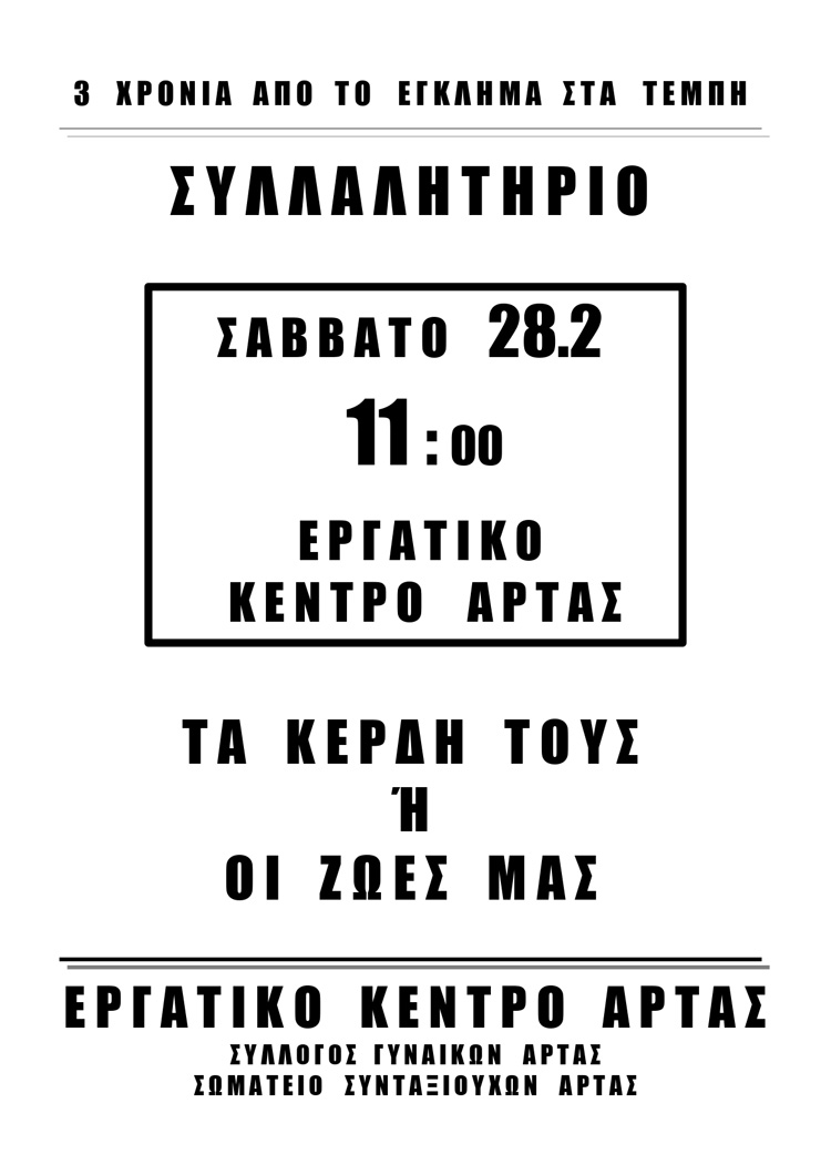 στοίχισε τη ζωή σε 57 συνανθρώπους μας και συγκλόνισε ολόκληρο τον λαό. Λίγες μέρες μετά, στις 23 Μάρτη, ξεκινά η κύρια δίκη» τονίζει σε ανακοίνωση το Εργατικό Κέντρο Άρτας που καλεί τα Σωματεία του ιδιωτικού και δημόσιου τομέα, όλους τους εργαζόμενους και τη νεολαία της Άρτας να δώσουν μαζικό, μαχητικό παρών στο συλλαλητήριο το ΣΑΒΒΑΤΟ 28 ΦΛΕΒΑΡΗ – 11:00 π.μ., στο ΕΡΓΑΤΙΚΟ ΚΕΝΤΡΟ ΑΡΤΑΣ.